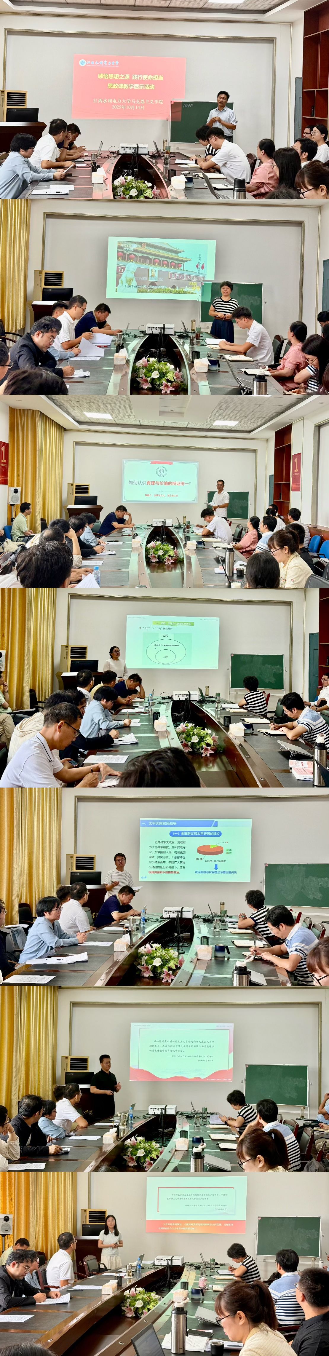 在教学展示环节,贺超海老师围绕参加第四届全国高校思政课教学展示活动作相关情况汇报并分享备赛经验和体会,并进行了以“寻路”为主题的教学展示,讲解中国共产党人走农村包围城市、武装夺取政权道路的艰辛探索。陈红老师围绕“何为实事求是”“为何要实事求是”以及“如何实事求是”进行了深入地讲解;王建东老师采用问题导入方式,引导学生认识和思考“真理与价值的辩证统一关系”;王红波老师以取自丹江口水源地的天然饮用水的价格为切入点,结合水利工程专业实际,深刻剖析为人民服务的本质,解答学生的思想困惑;伍冠星老师对太平天国运动的背景、意义等进行了深入讲解;况宇老师从现实国情、时代背景出发讲解新民主主义革命理论是如何形成的;李丽利老师通过案例讲解,分析如何理解中国共产党的领导是中国特色社会主义制度的最大优势。