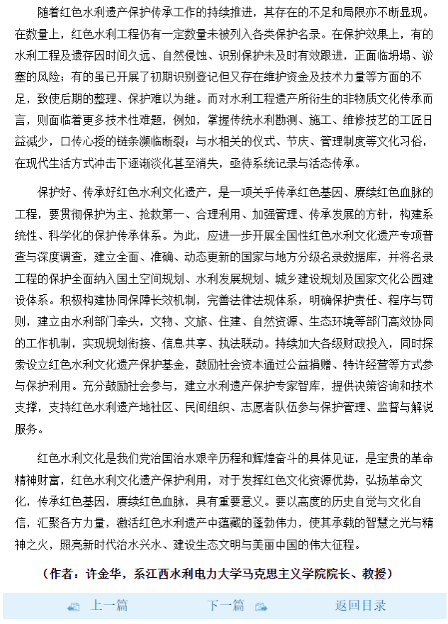 文章指出,红色水利文化是我们党治国治水艰辛历程和辉煌奋斗的具体见证,是宝贵的革命精神财富。新时代以来,党和政府在高度重视治水事业、加强水利工程建设的同时,将水利遗产的保护、传承提高到文化兴国的新高度。要以高度的历史自觉与文化自信,汇聚各方力量,激活红色水利遗产中蕴藏的蓬勃伟力,使其承载的智慧之光与精神之火,照亮新时代治水兴水、建设生态文明与美丽中国的伟大征程。(文/图 况宇)