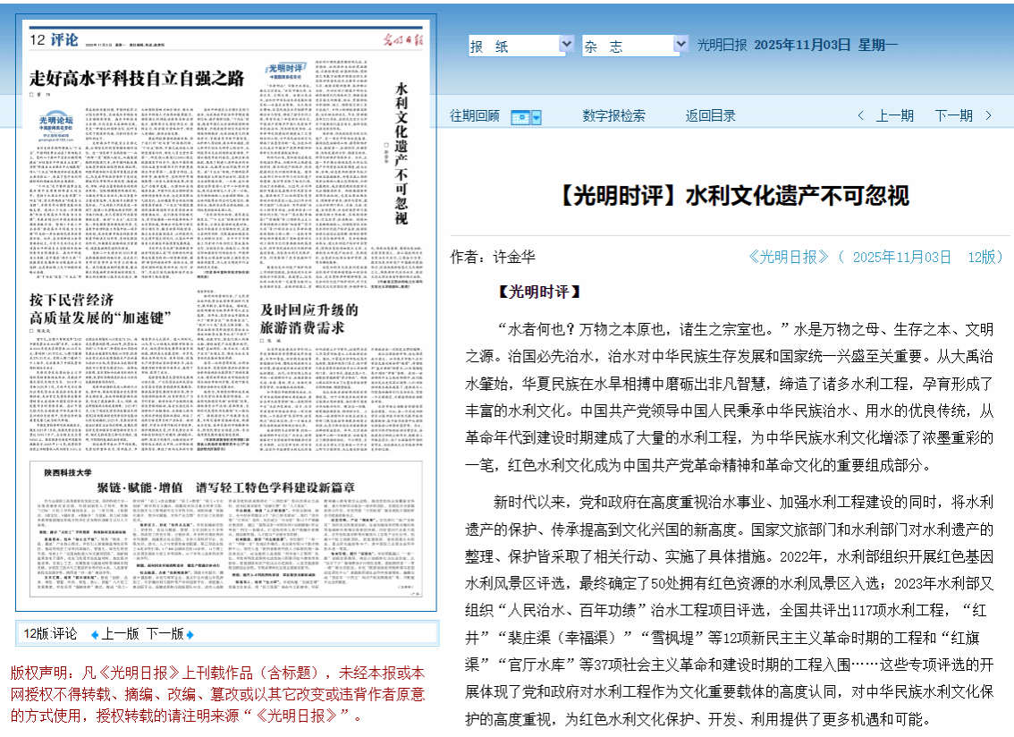 11月3日,我校威廉williamhill院长许金华教授在《光明日报》发表题为《水利文化遗产不可忽视》评论文章。